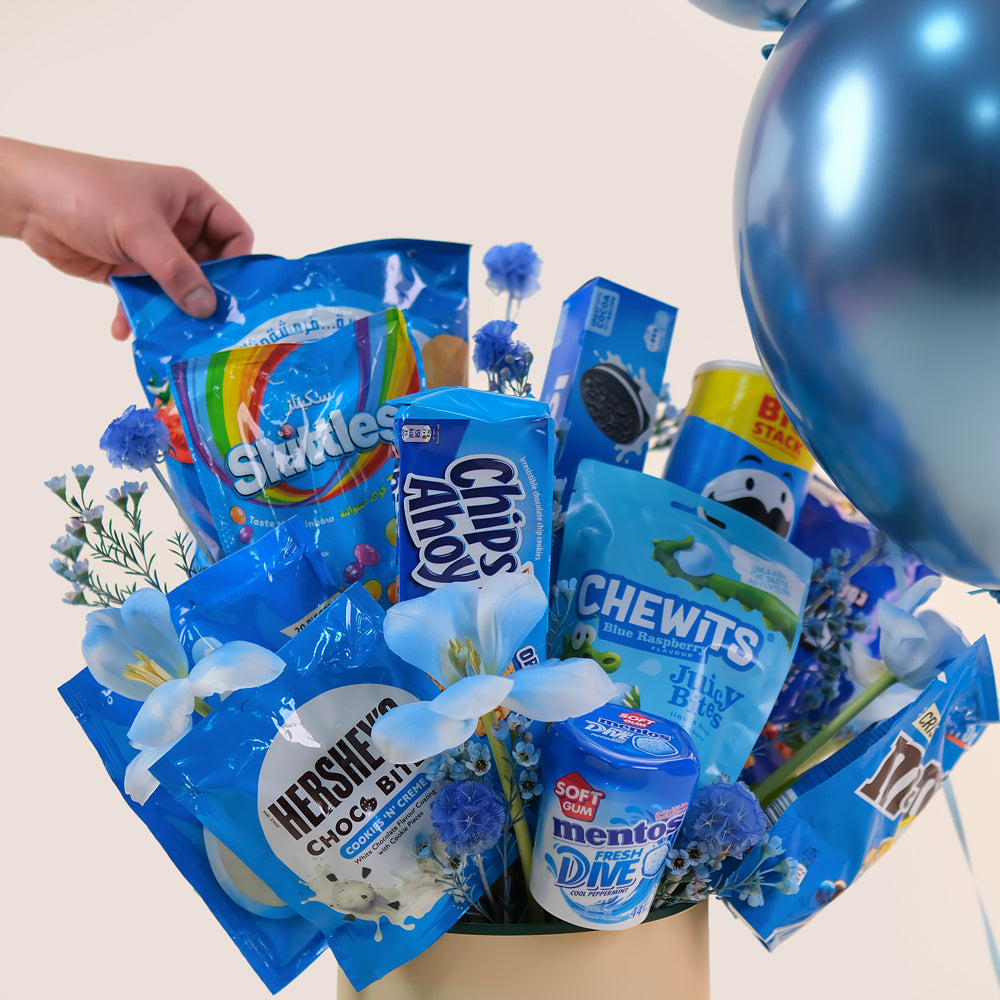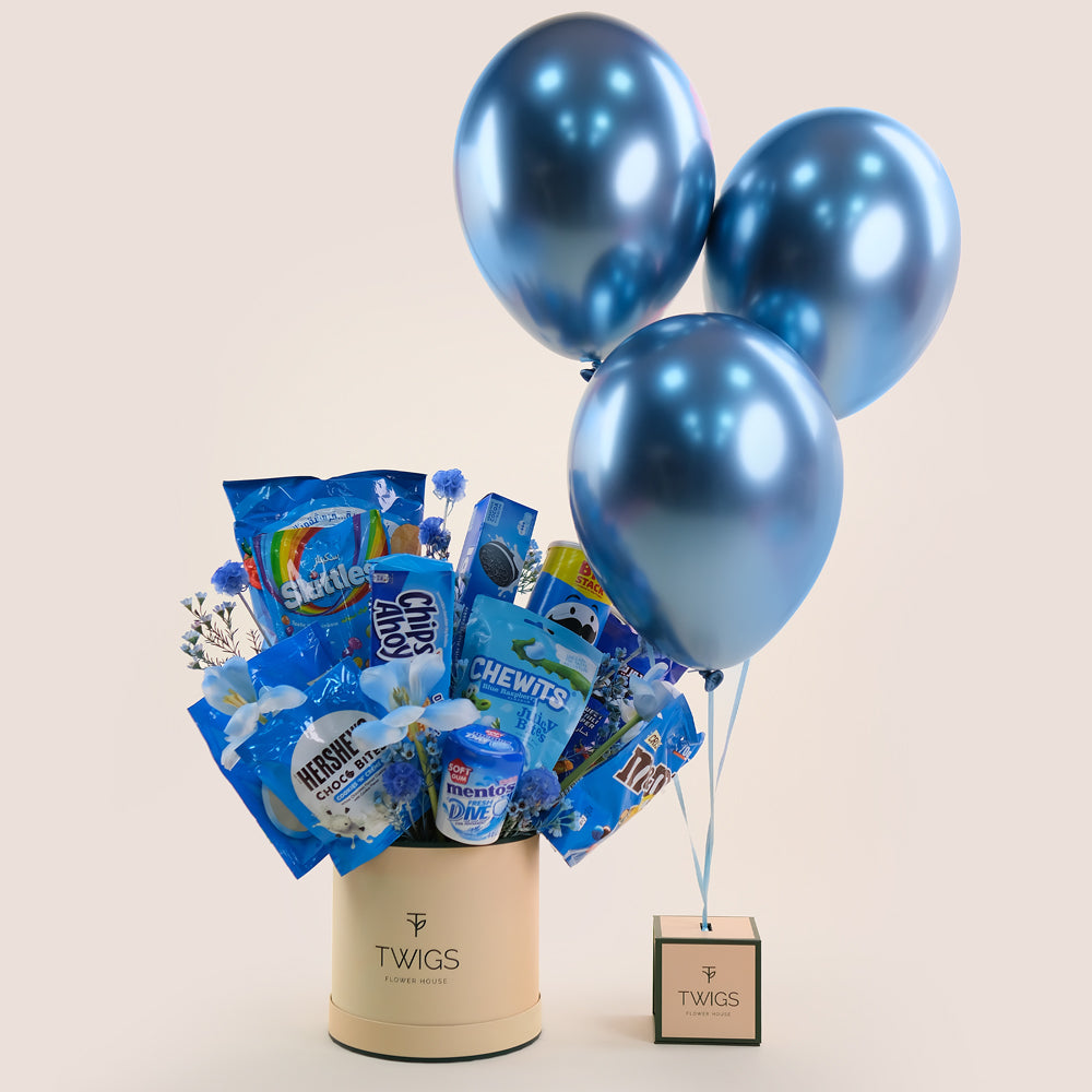 Touch of Blue Birthday Bundle | Flower Bouquet with Balloons & Cake Dubai & UAE