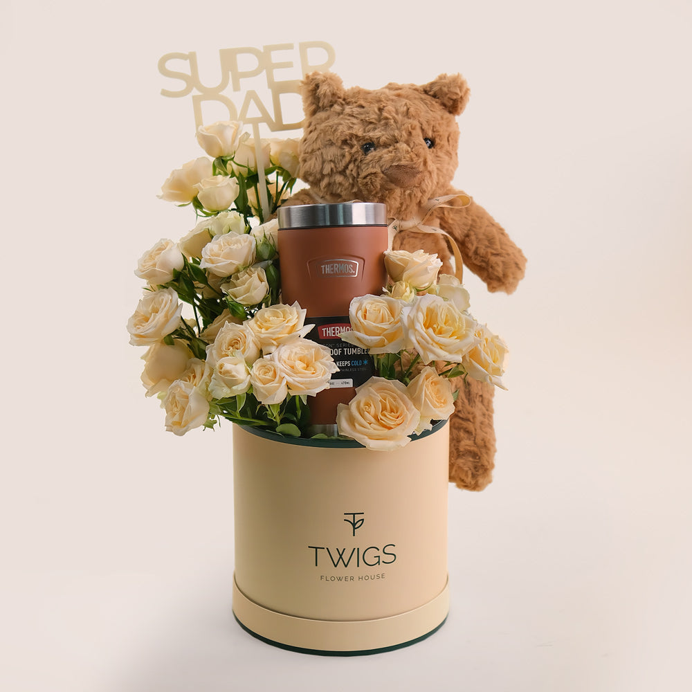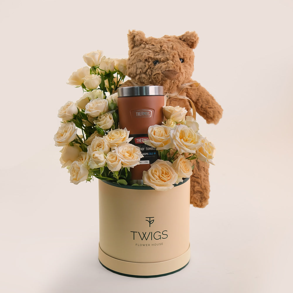 Ivory Bloom Flower Bouquet in TWIGS Signature Bag Birthday Bundled with Cake and Balloons