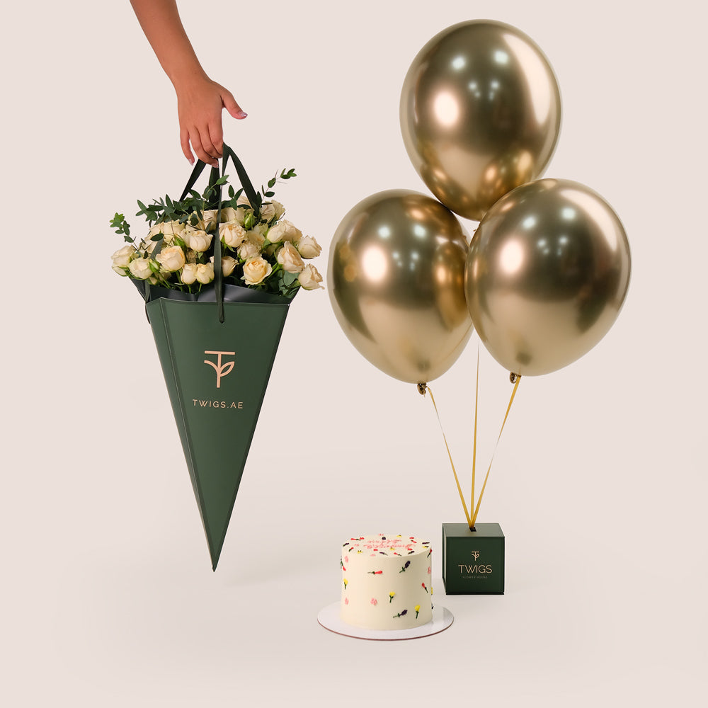 Golden Bliss Cone Salinero Spray Roses, Balloons & Birthday Cake Bundle – A Stunning Gift of Elegance, Celebration, and Sweetness