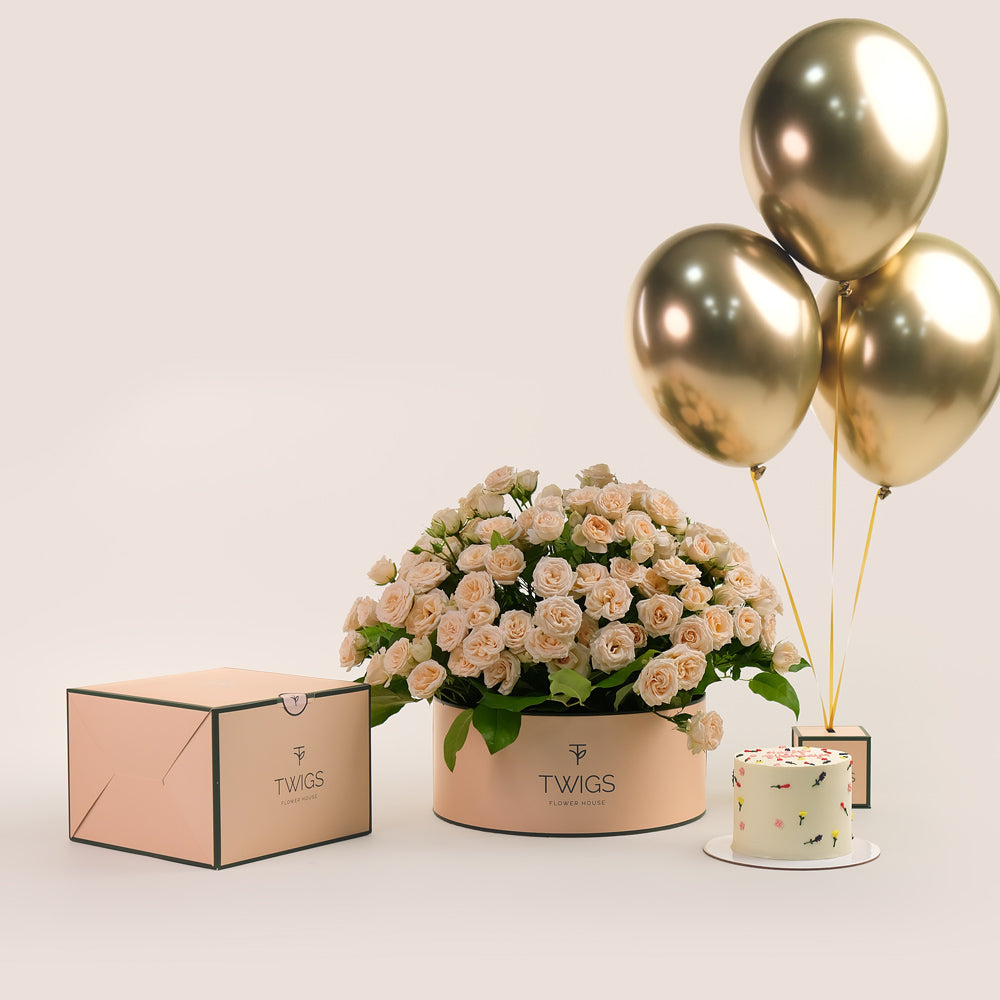 Blush Celebration Bundle – Birthday Flowers, Balloons & Cake - The Perfect Surprise