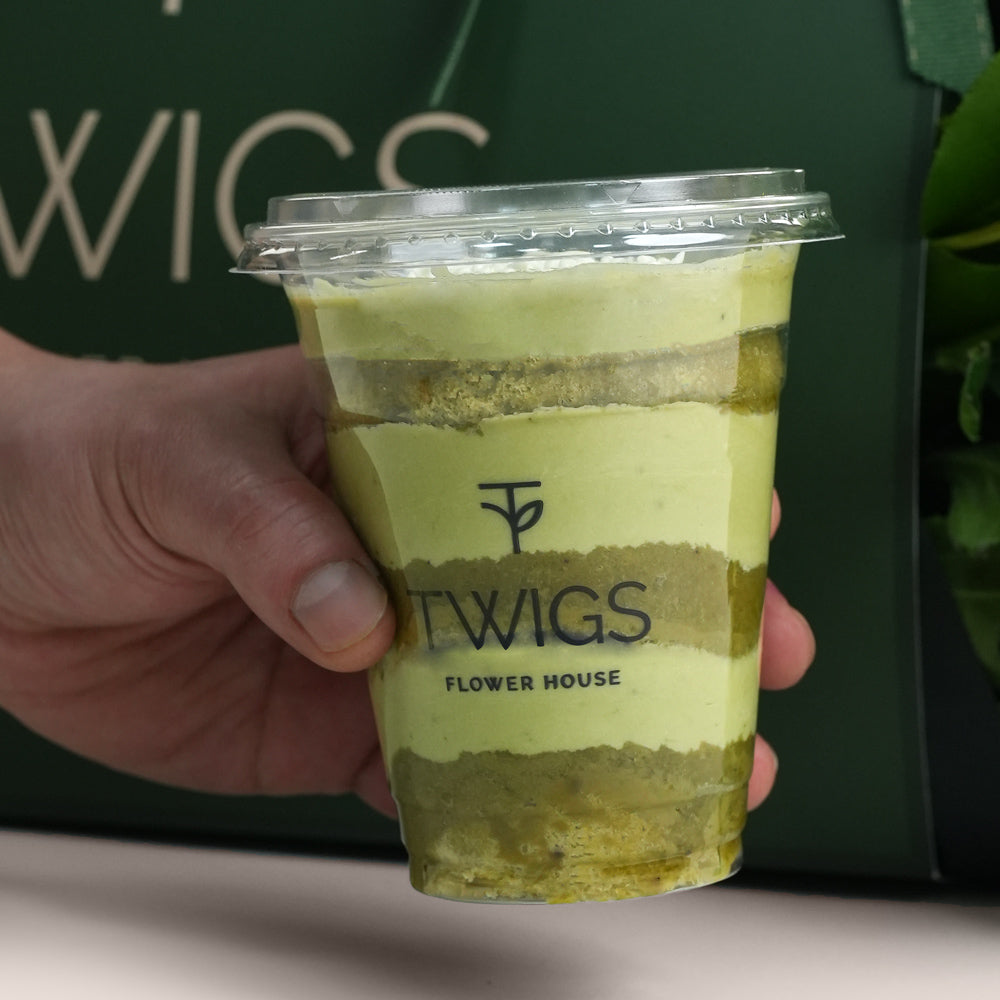 TWIGS exclusive matcha cake in a cup with “I love u soooo matcha” icing