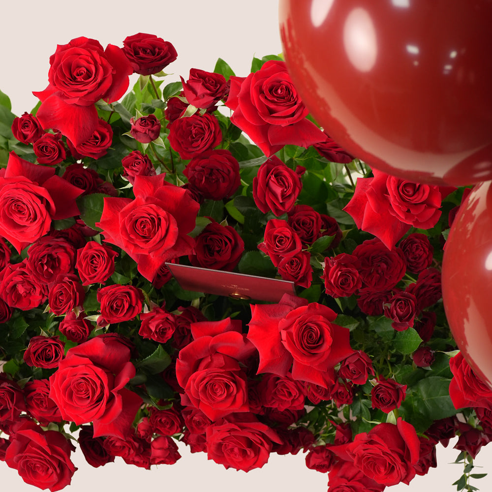 Dear Love Garden is a luxurious red roses garden box overflowing with fresh premium blooms and beautifully paired with elegant red balloons — designed to create an unforgettable Valentine’s Day moment filled with love and romance.
