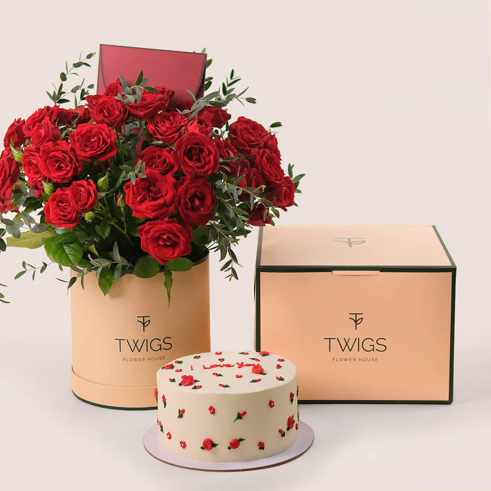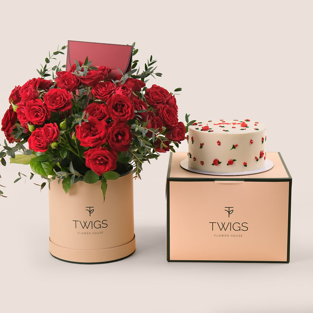This beautifully curated bundle features lush Pushkin red spray roses, arranged in TWIGS’ Deluxe Round Flower Box, exuding romantic elegance. Paired with a 1kg handcrafted floral ‘I Love You’ cake, this set is a stunning expression of love and devotion.