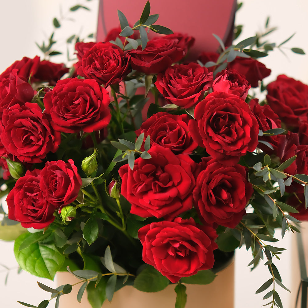 - Premium Pushkin red spray roses, elegantly arranged in TWIGS’ Deluxe Round Flower Box