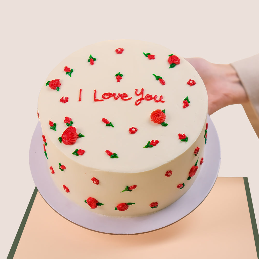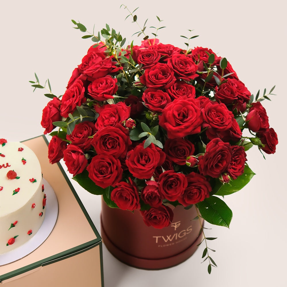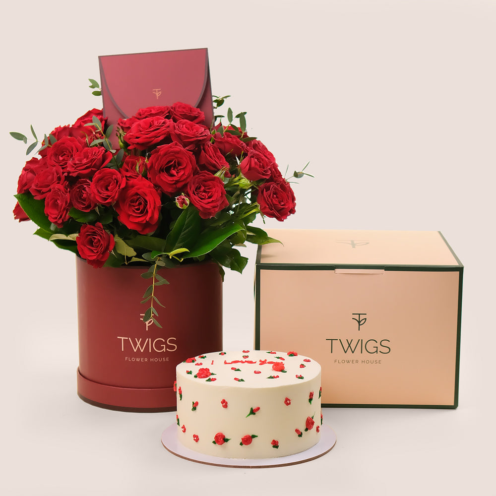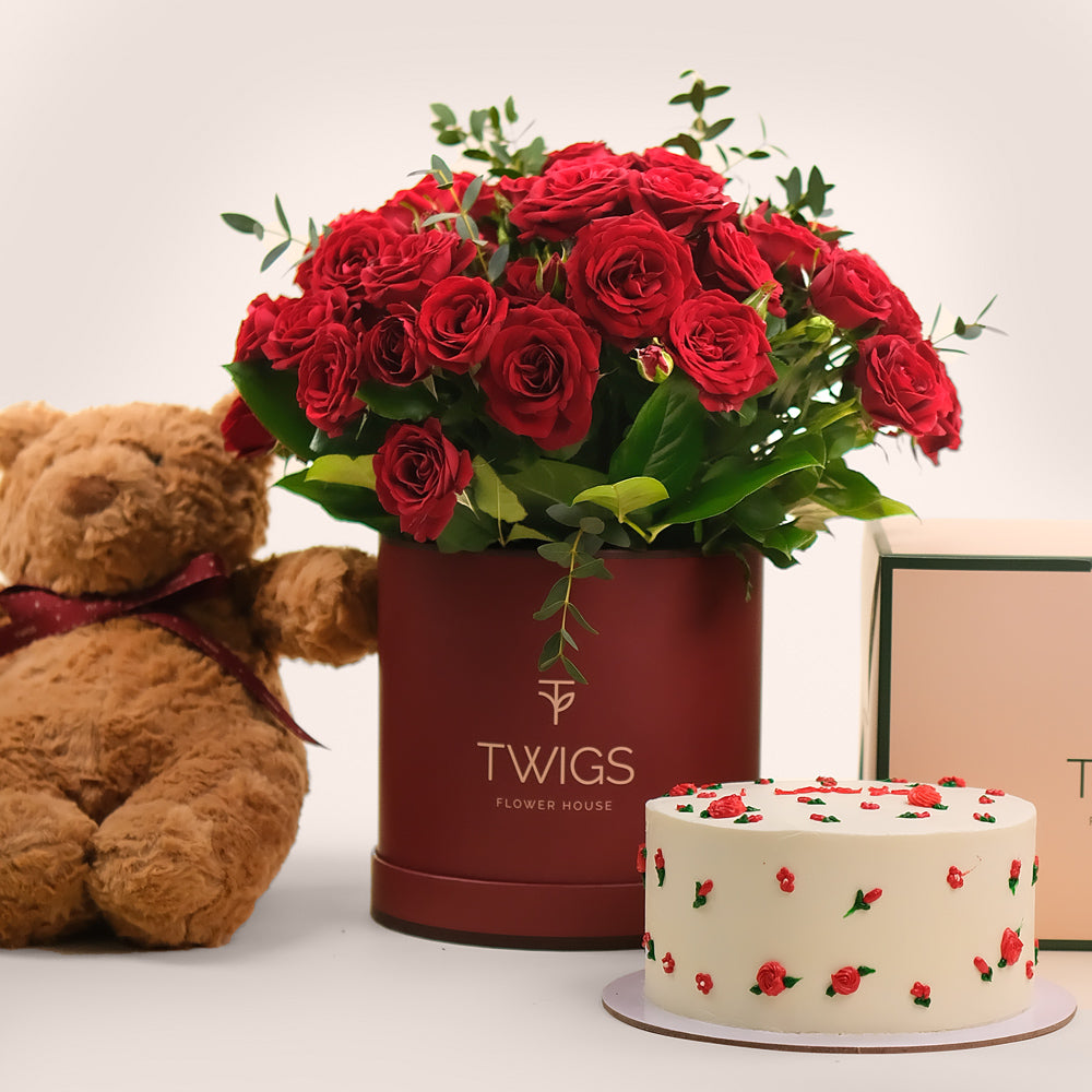 This elegant set features premium red roses, beautifully arranged in TWIGS’ Limited Edition Burgundy Round Box, exuding timeless romance. Paired with a soft and cuddly plush teddy bear and a 1kg handcrafted floral ‘I Love You’ cake, this gift is designed to bring joy and warmth to your loved one’s heart.