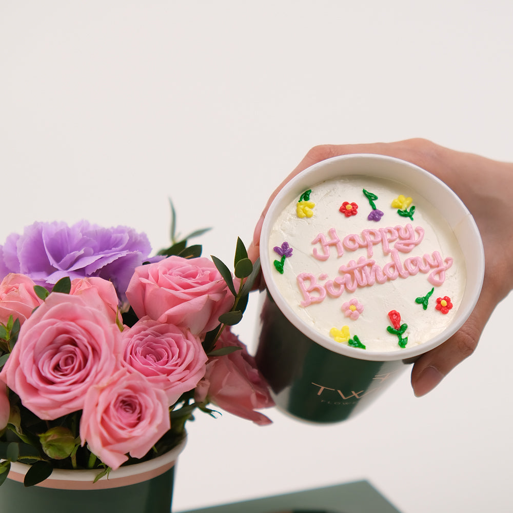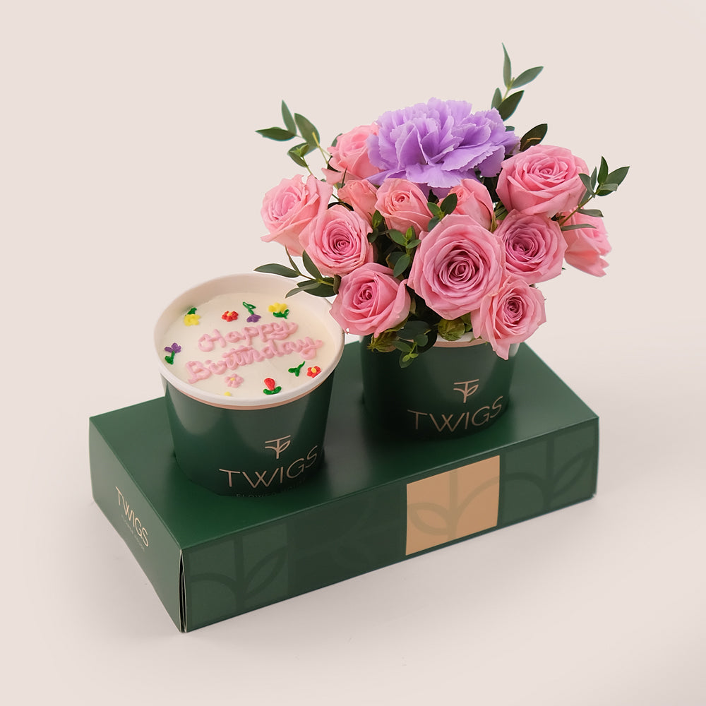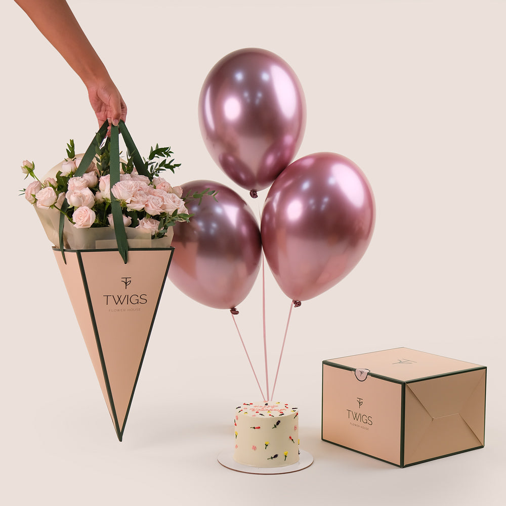 Festive Garden Box with Balloons & Birthday Cake – Flower Delivery Dubai