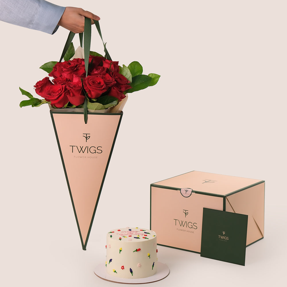 Ivory Bloom Flower Bouquet in TWIGS Signature Bag Birthday Bundled with Cake and Balloons