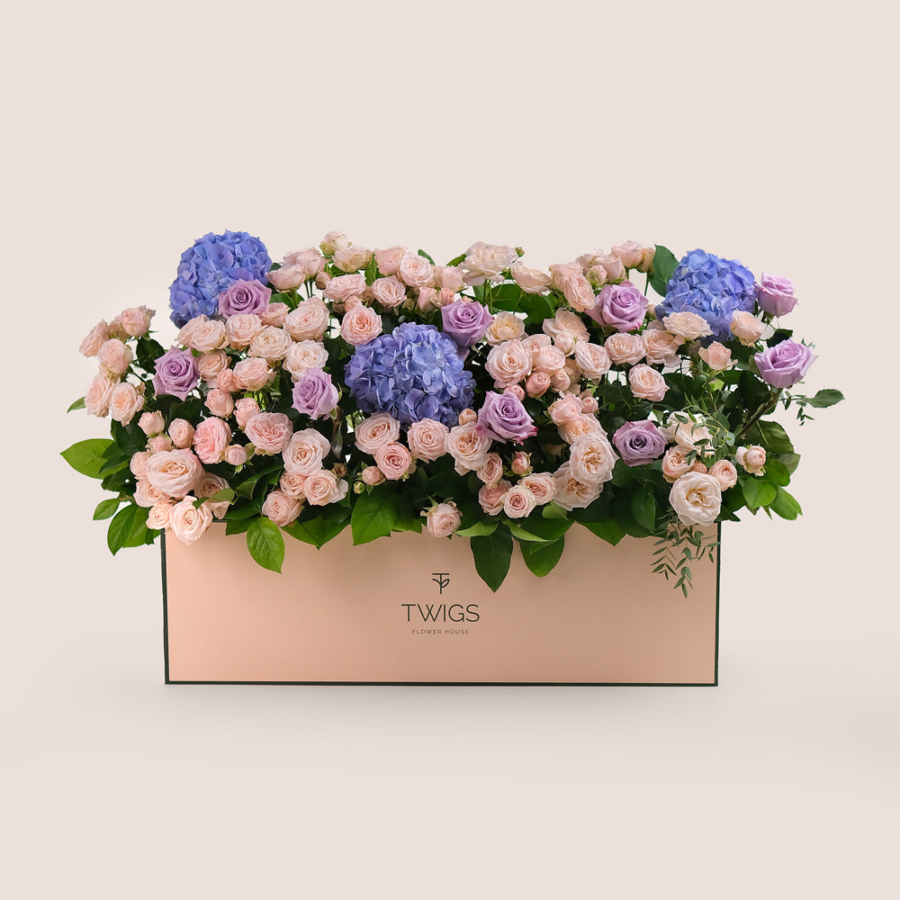 Premium Flowers in a Garden Box – A Lush Display of Purple Hydrangeas, Lavender Roses & Bombastic Blooms