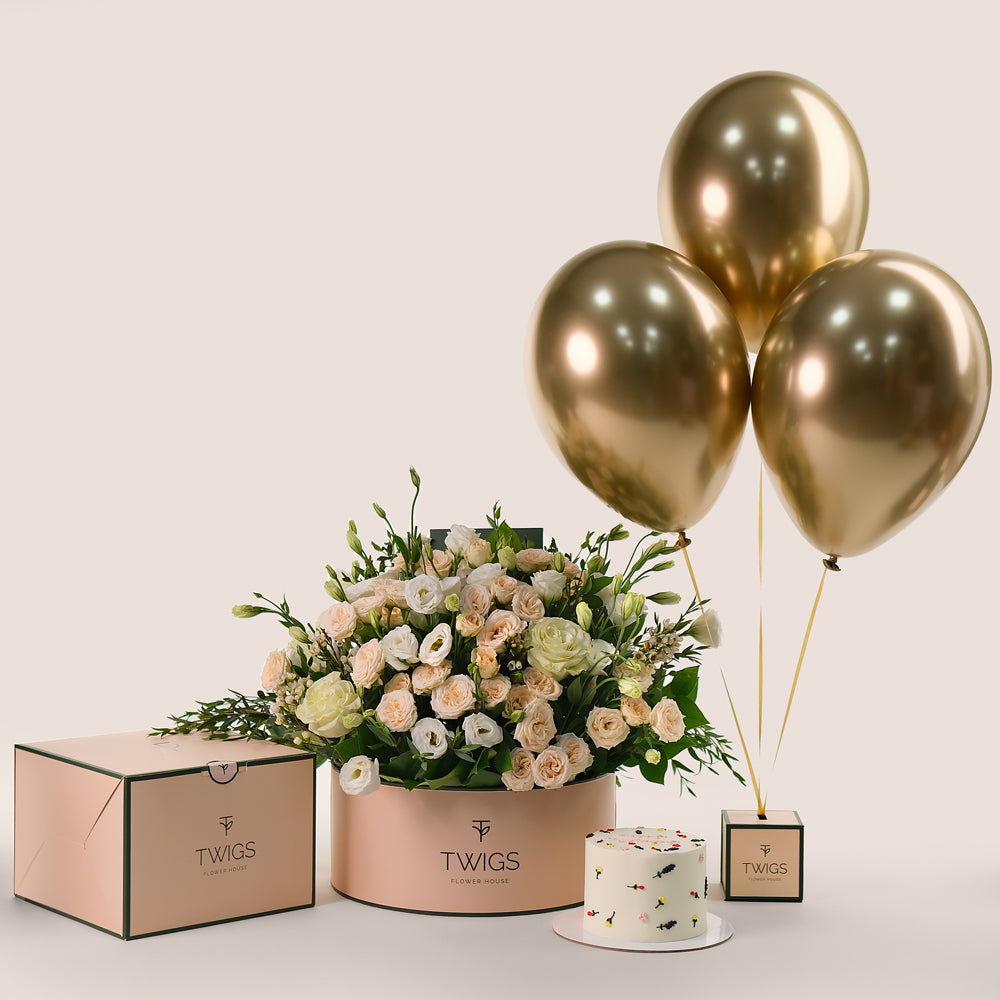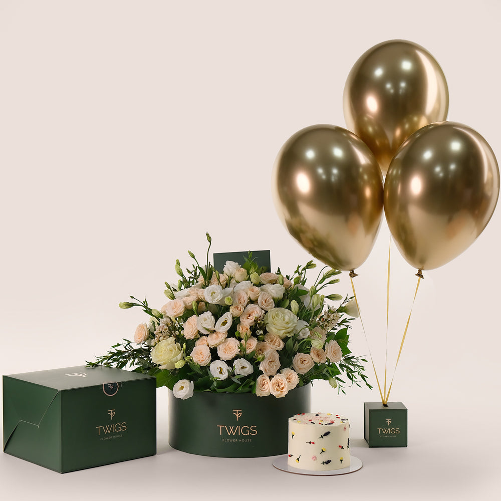 Pure Elegance Bundle - Lisianthus White Flowers & Chocolates with Balloons | Elegant Gift Dubai & UAE