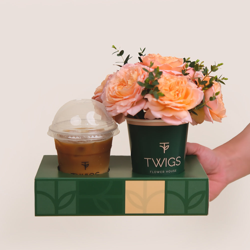 Iced Spanish Latte & Juliet Peach Roses in a Cup – A Sweet Floral Pick-Me-Up