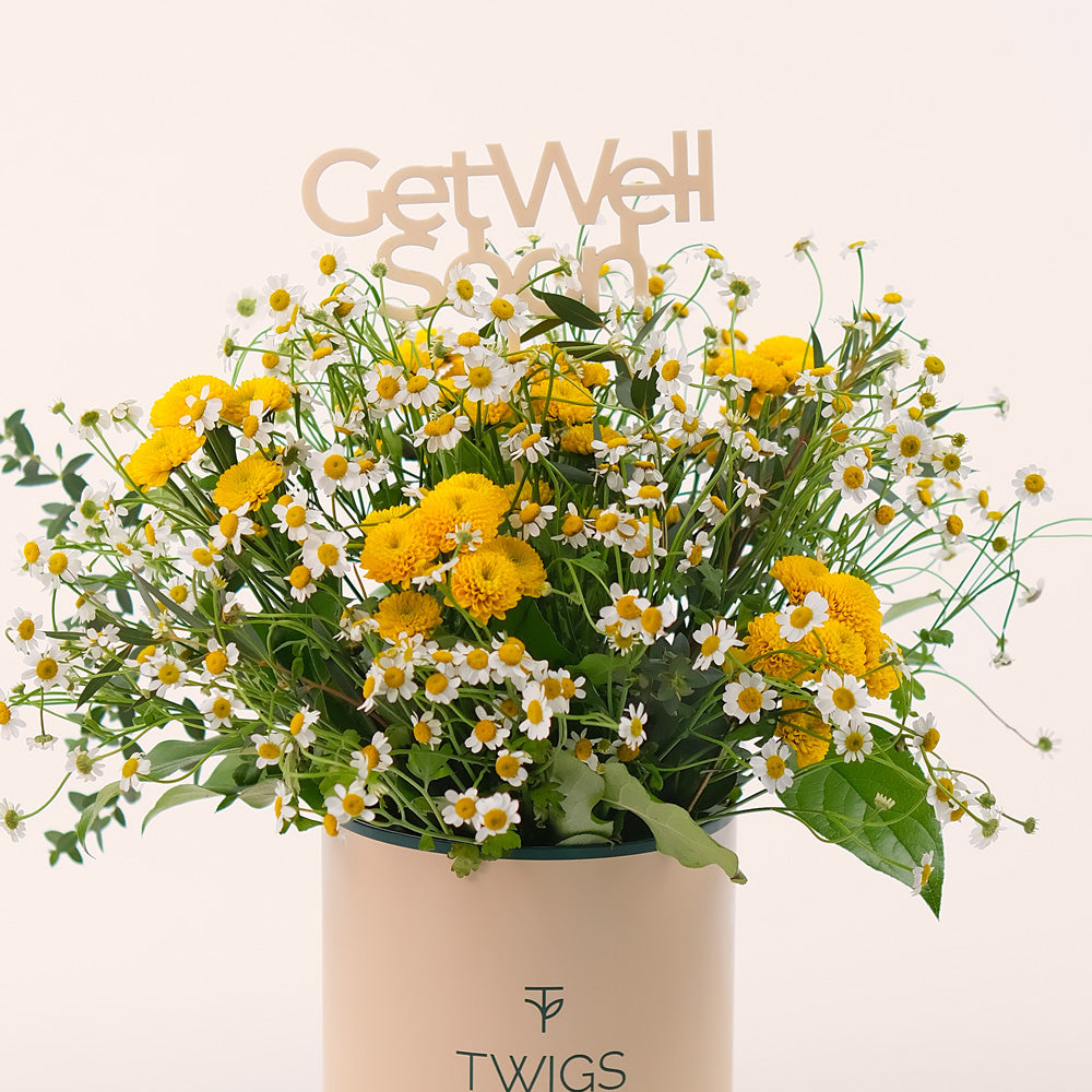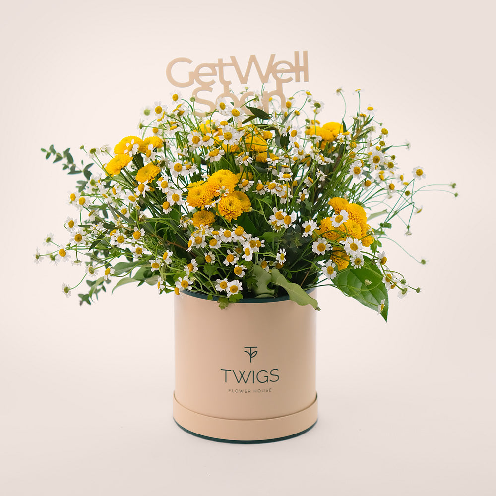 Chamomile & Yellow Santini in Deluxe Round Box – Get Well Soon