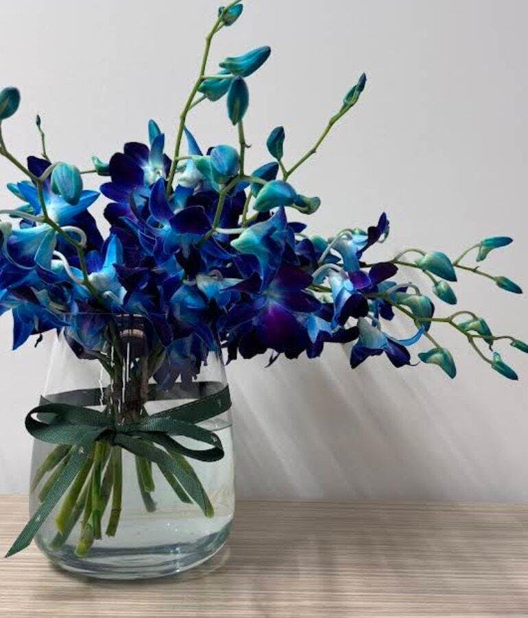 Delicate yet striking, this petite arrangement of blue dendrobium orchids brings a modern touch of tropical elegance — whether you’re sending a gift for him, celebrating a baby boy, or simply sharing something uniquely beautiful.