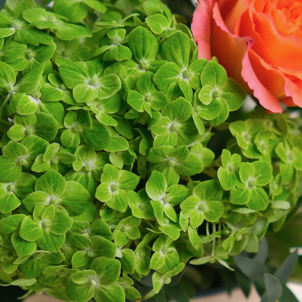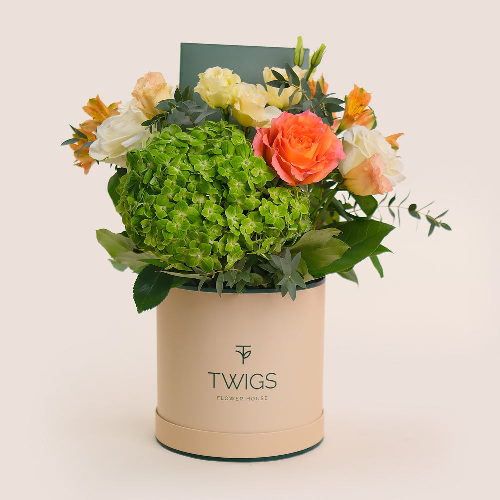 Arranged in our deluxe round flower box, this bouquet features a radiant mix of orange and white roses, peach lisianthus, and green hydrangea — a warm and elegant palette perfect for the season.