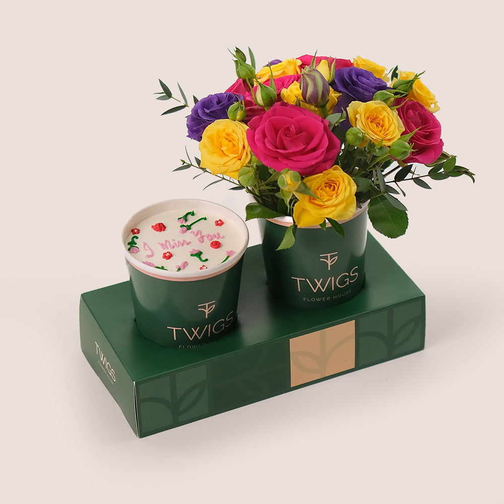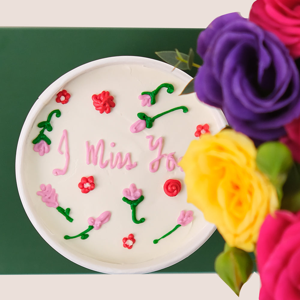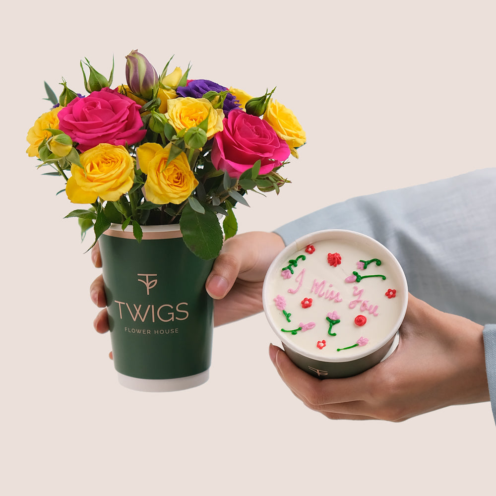 Because sometimes, a few blooms and a bite of sweetness say it best. This TWIGS signature combo features a colorful mix of fresh flowers arranged in a takeaway cup, paired with a cake in a cup adorned with delicate floral design and an “I Miss You” icing message.