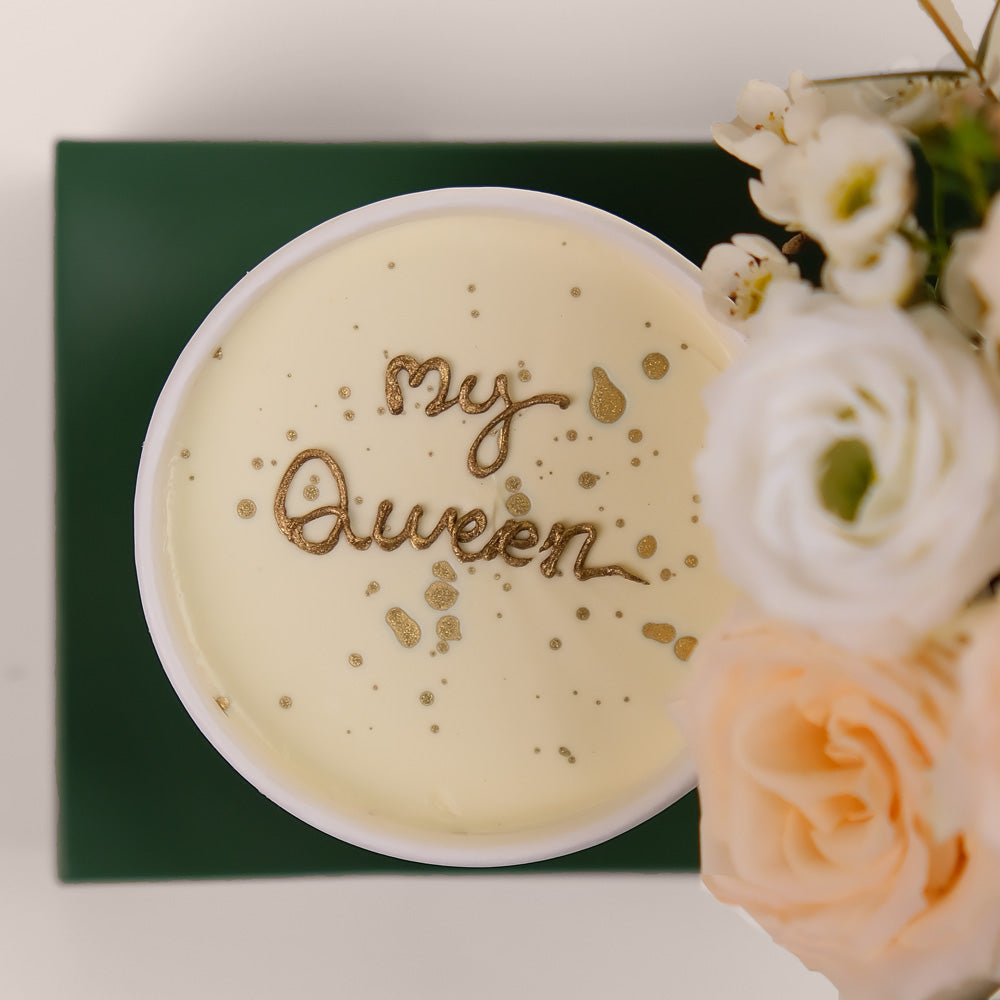 - Best-Selling Cake in a Cup – A decadent, freshly made dessert, decorated with intricate floral icing and the heartfelt message “My Queen”, making it the perfect sweet gesture for someone special.