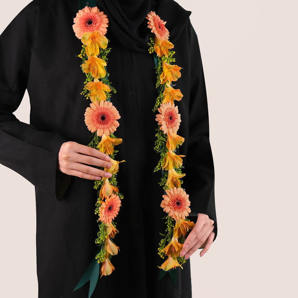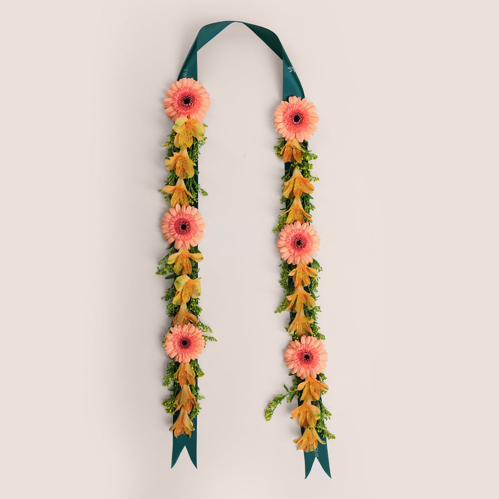 Celebrate success with a handcrafted graduation flower lei that radiates joy and pride. This wearable floral necklace is made with orange alstroemerias and peach gerberas, symbolizing enthusiasm, warmth, and admiration — a perfect gift to honor the Class of 2025.