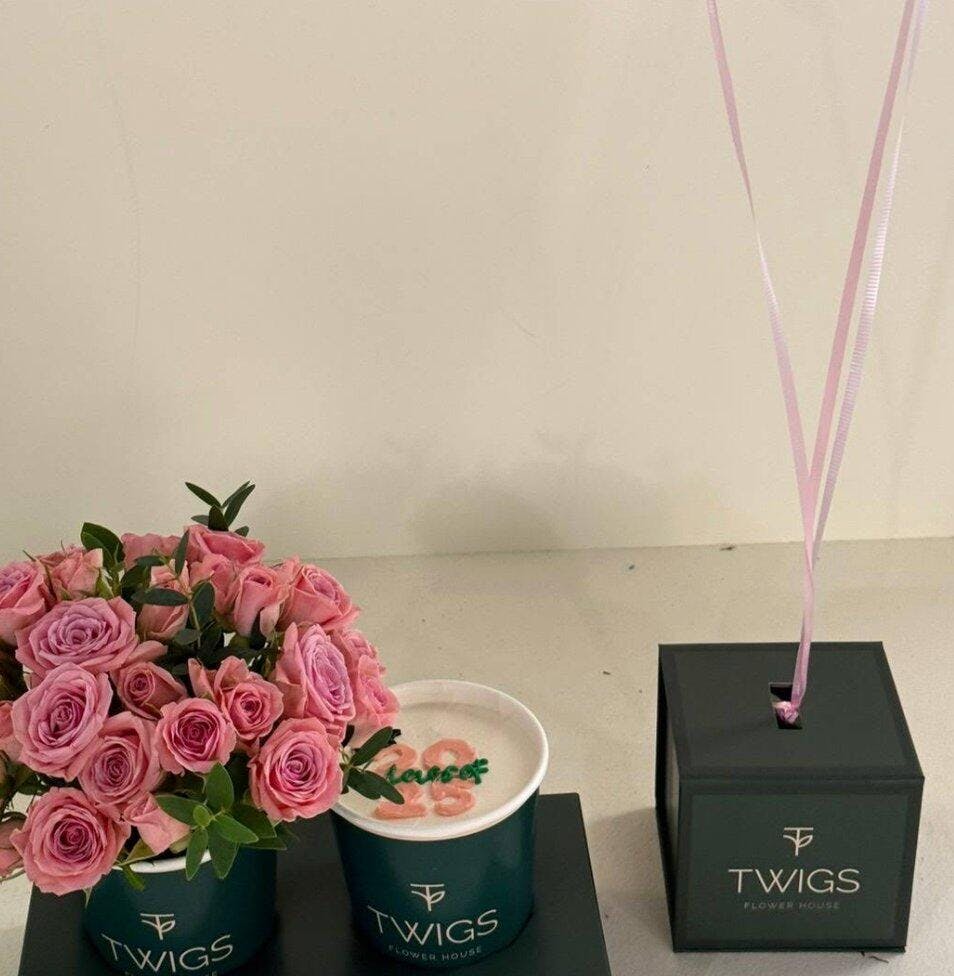 Celebrate the Class of 2025 with a cheerful and compact gift that brings together all the essentials — fresh flowers, a sweet treat, and balloons! This fun and thoughtful TWIGS combo includes a cup of pink spray roses, a cake in a cup with icing that reads “Class of 2025,” and three pink chrome balloons displayed in our signature balloon box holder.