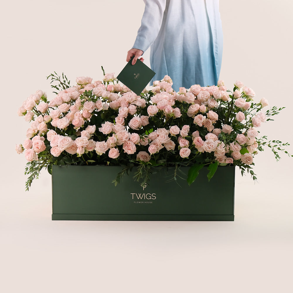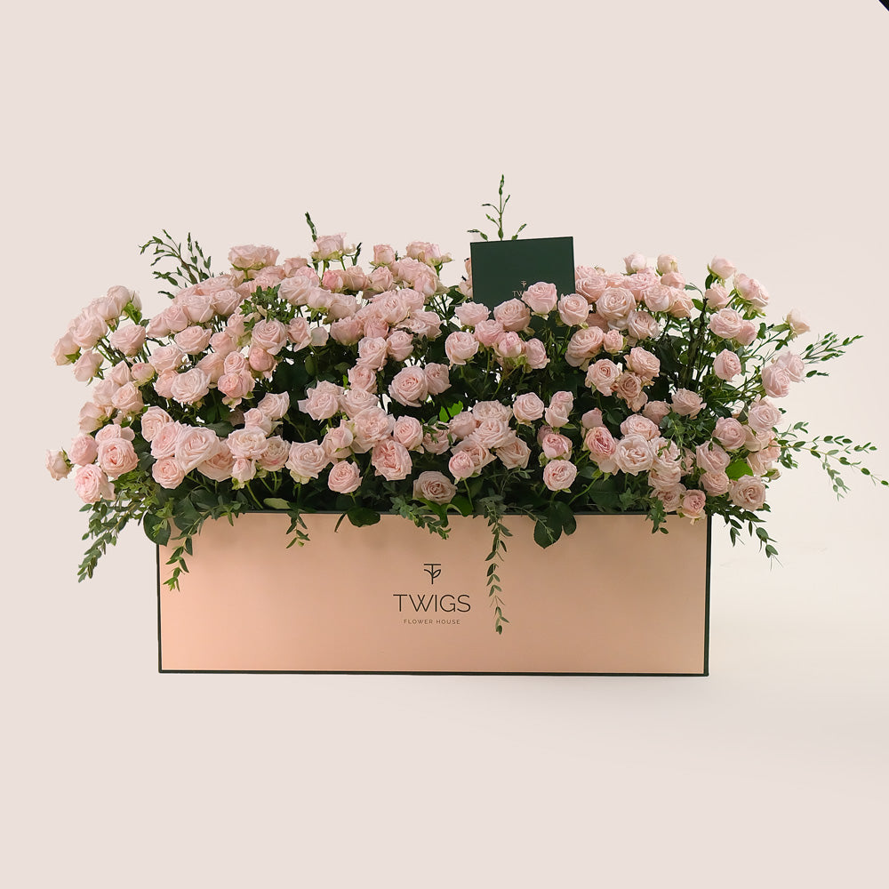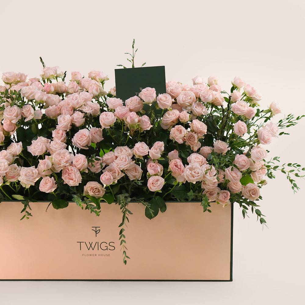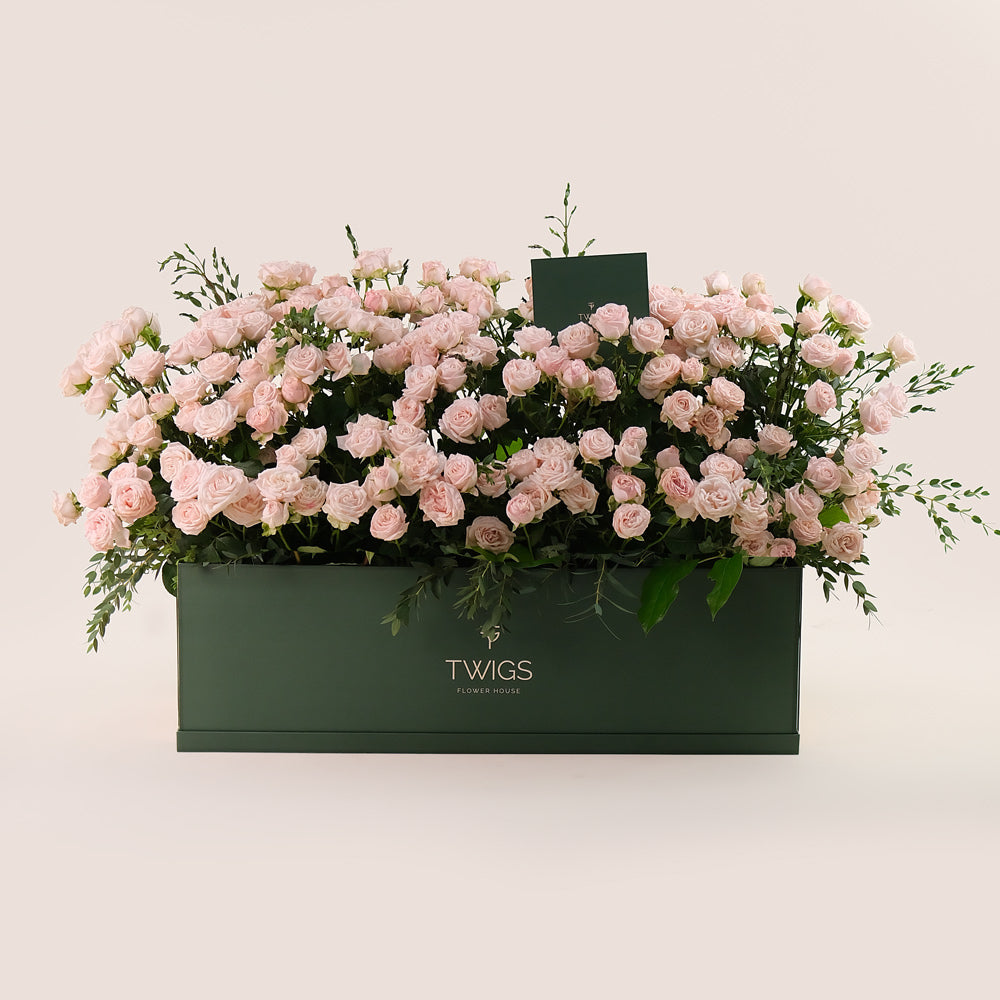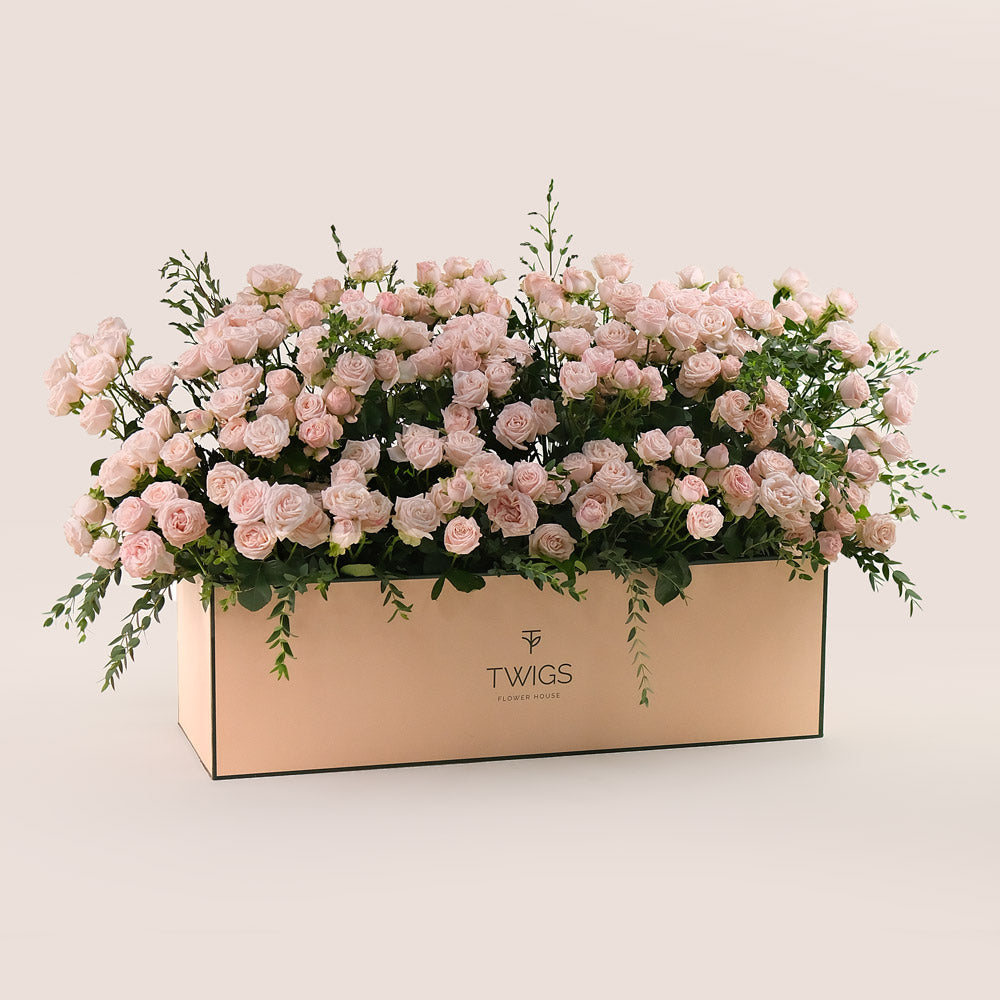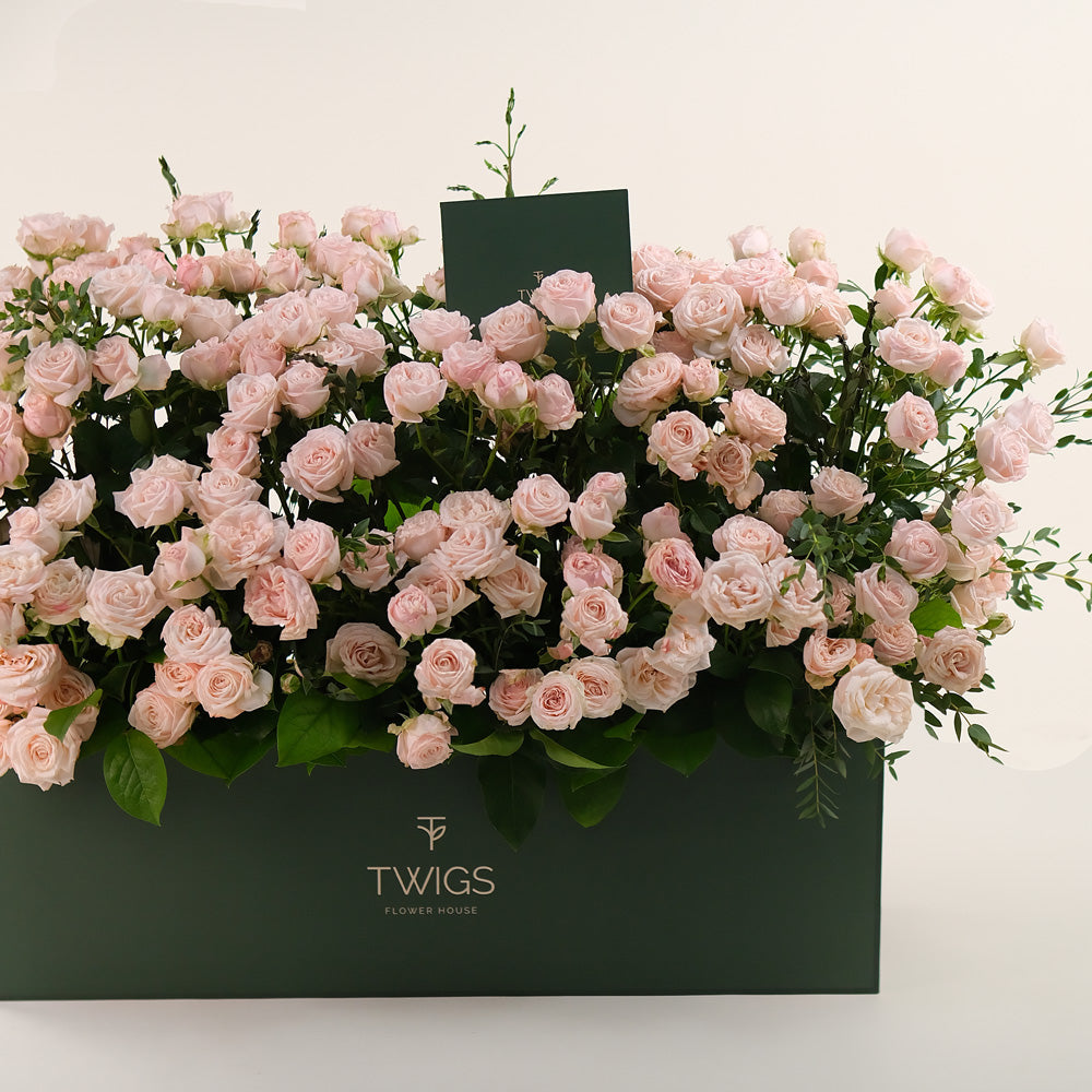 Create a lasting impression with our Premium Garden Box, filled with lush Bombastic Spray Roses in soft pink tones and delicate Parvifolia Leaves for a hint of natural greenery. Styled like a blooming flower bed, this arrangement brings together gentle colors and textures, making it ideal for birthdays, romantic gestures, or simply adding beauty to someone’s day.