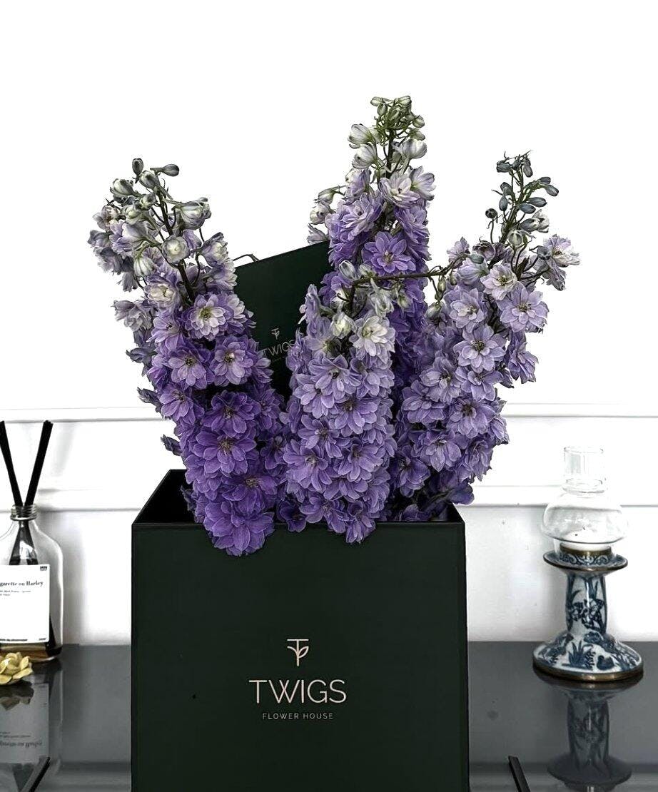 Expertly arranged with seasonal delphiniums in rich shades of violet and lavender, this bouquet is a timeless expression of admiration, elegance, and care. Presented in our premium TWIGS signature carry bag, available in TWIGS Green or Warm Beige, this arrangement is a thoughtful gift for birthdays, sympathy, home styling, or simply brightening someone’s day.