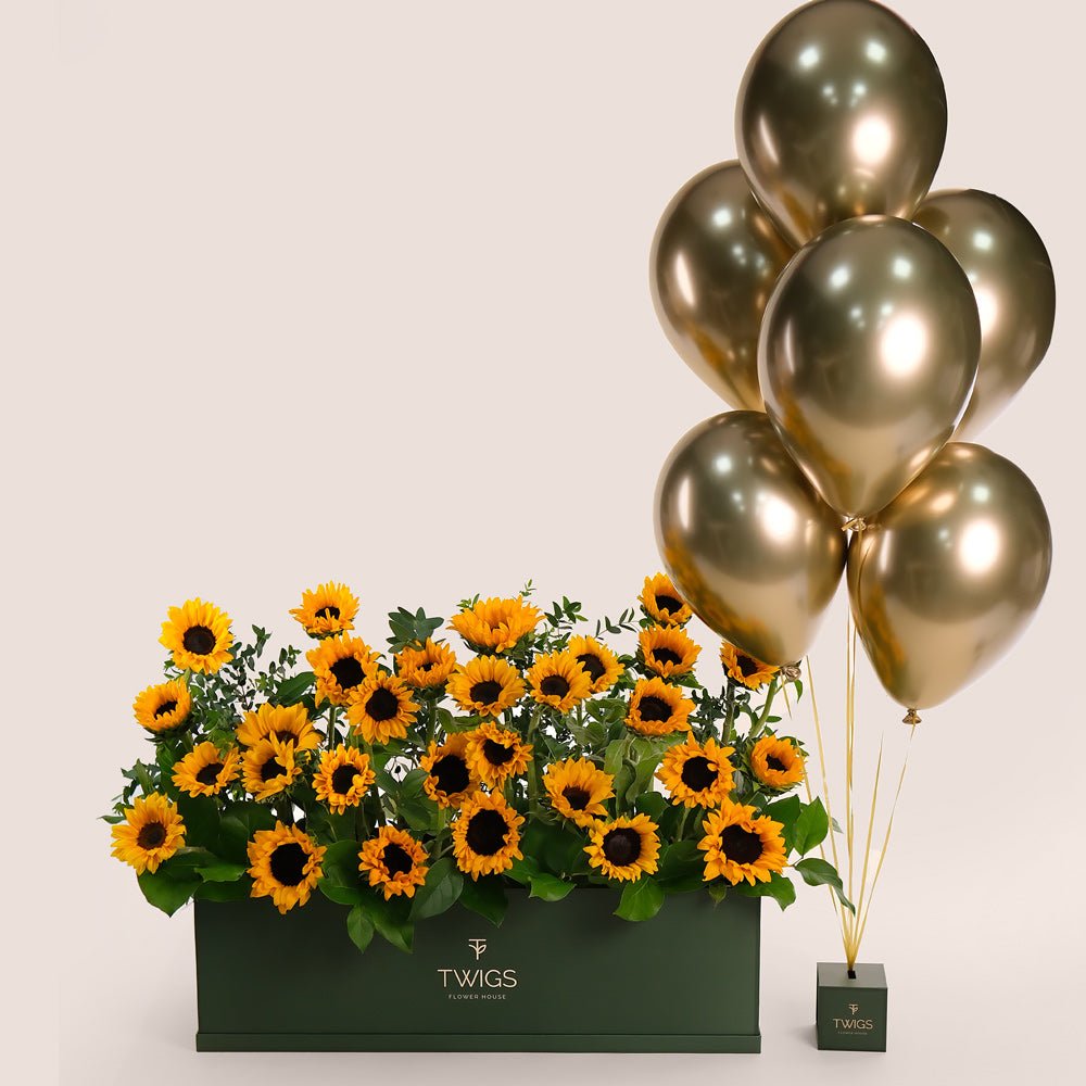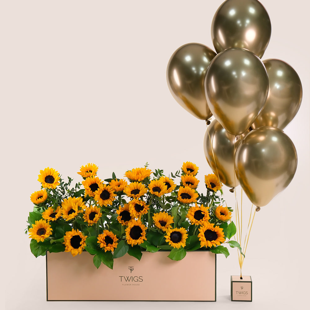Sunflower Garden Box with Gold Balloons – Same-Day Delivery Dubai