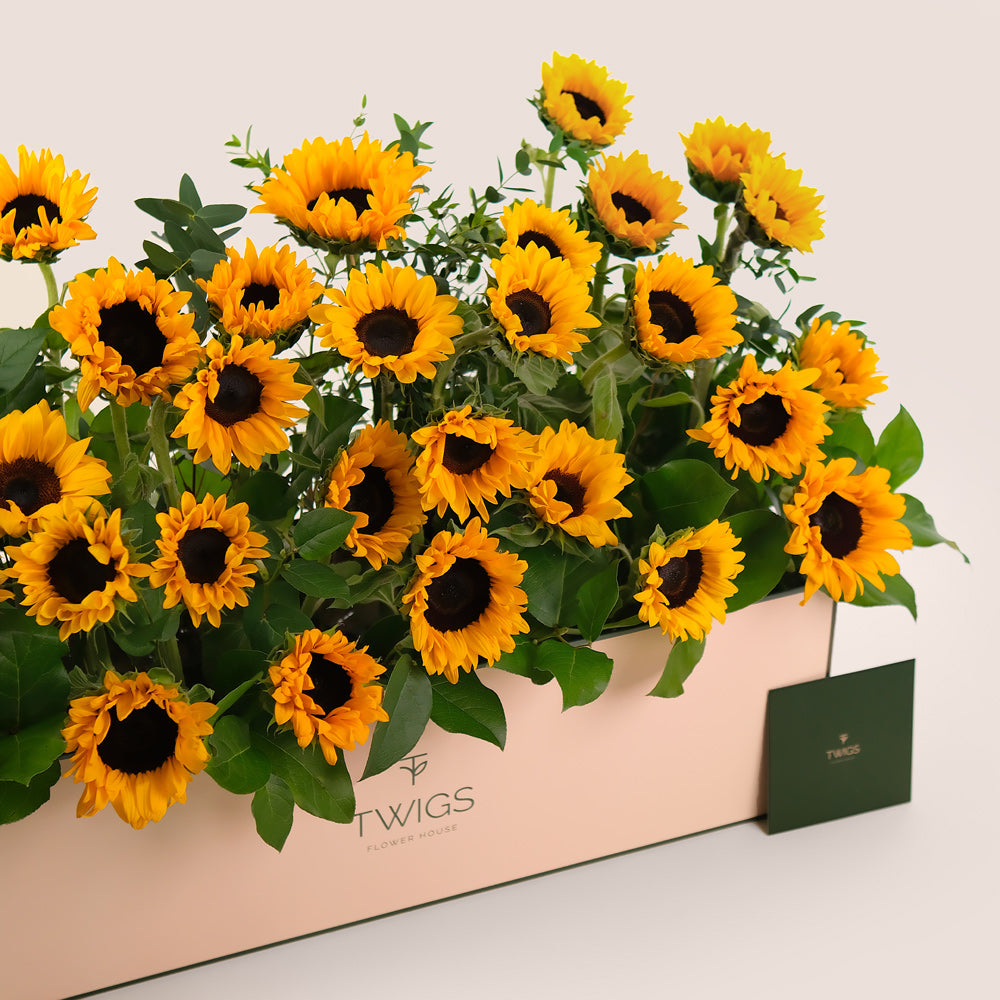 Each box is filled with fresh, radiant sunflowers hand-arranged by our florists to resemble a blooming garden bed. The golden balloons add a festive touch — ideal for moments that call for a little extra cheer.