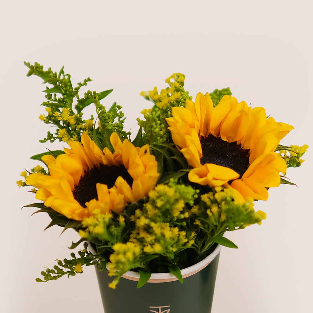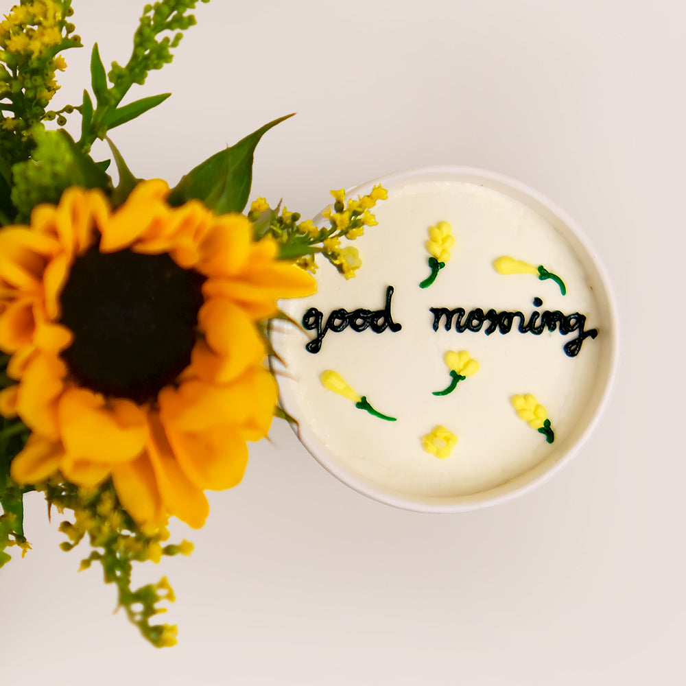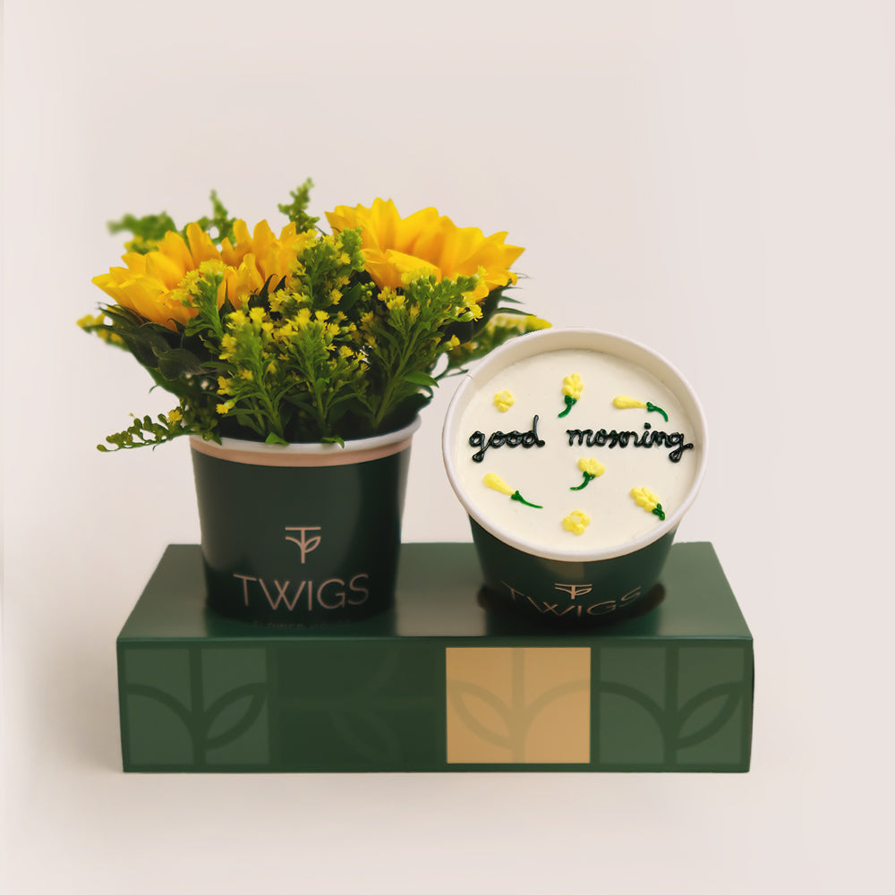 Say “good morning” in the sweetest way possible — with a burst of sunshine and a bite of joy. This TWIGS favorite features a fresh cup of cheerful sunflowers paired with a delicious cake in a cup, iced with a handwritten message that reads "Good Morning."