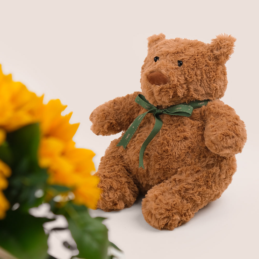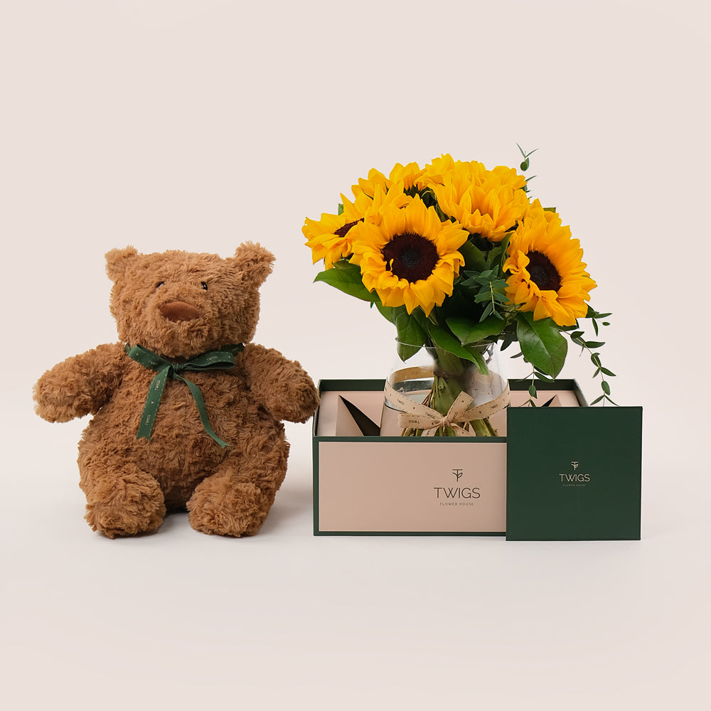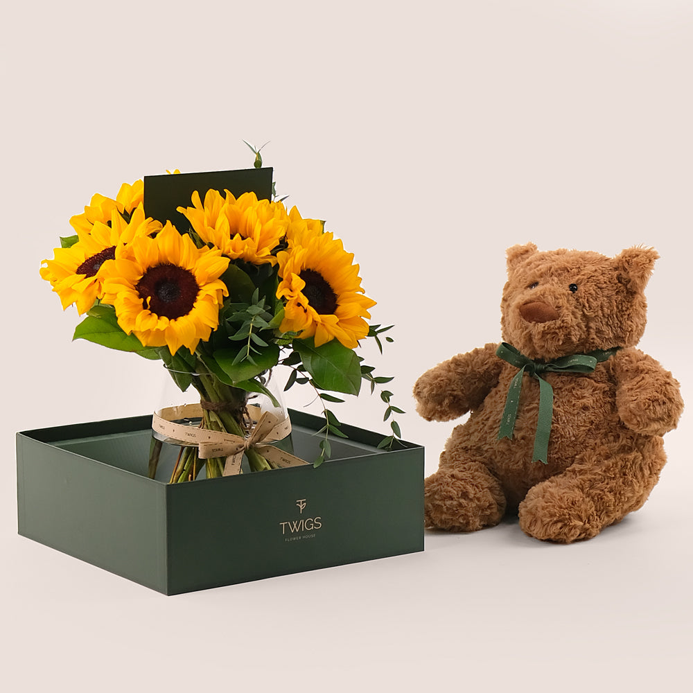 Say good morning with sunshine in a vase! Our Sunshine Bliss bundle is designed to lift spirits and spark smiles. Featuring bright, happy sunflowers carefully arranged in a petite clear vase, this thoughtful gift is paired with our adorable TWIGS teddy bear — making it perfect for warm gestures and heartfelt surprises.